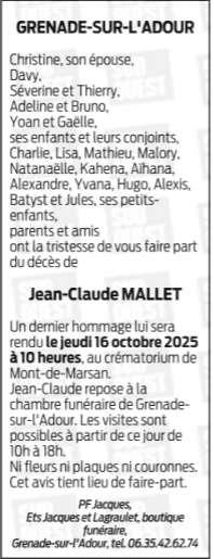 Died in Grenade-sur-l'Adour (40270, France) on 10 October 2025 at the age of 76 years