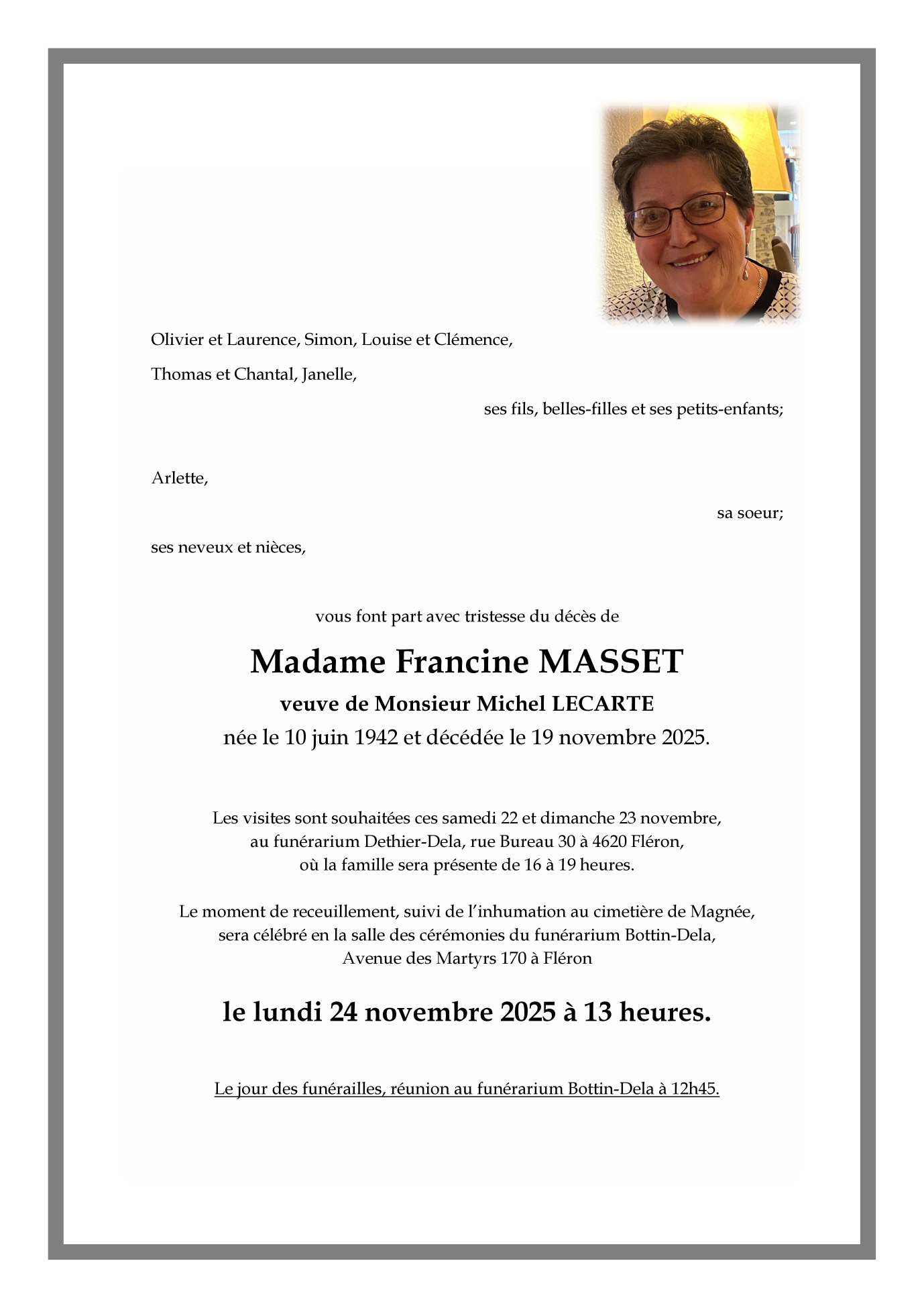 Décédée à Liège (4000, Belgique) le mercredi 19 novembre 2025 à l'âge de 83 ans