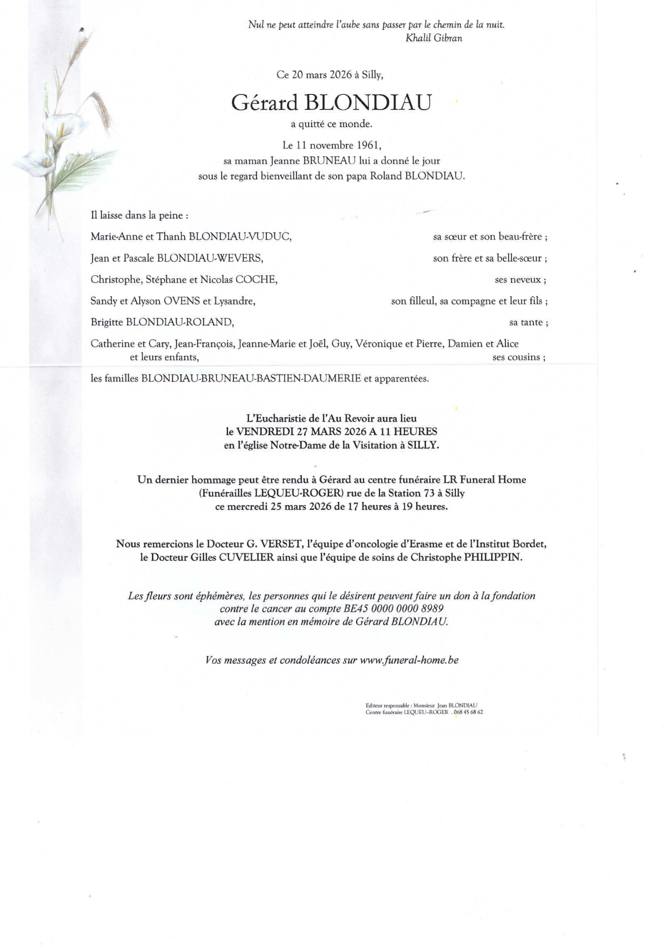 Décédé à Silly (7830, Belgique) le vendredi 20 mars 2026 à l'âge de 64 ans
