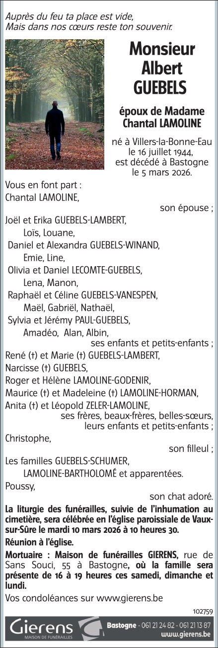 Décédé à Bastogne (6600, Belgique) le jeudi 5 mars 2026 à l'âge de 81 ans