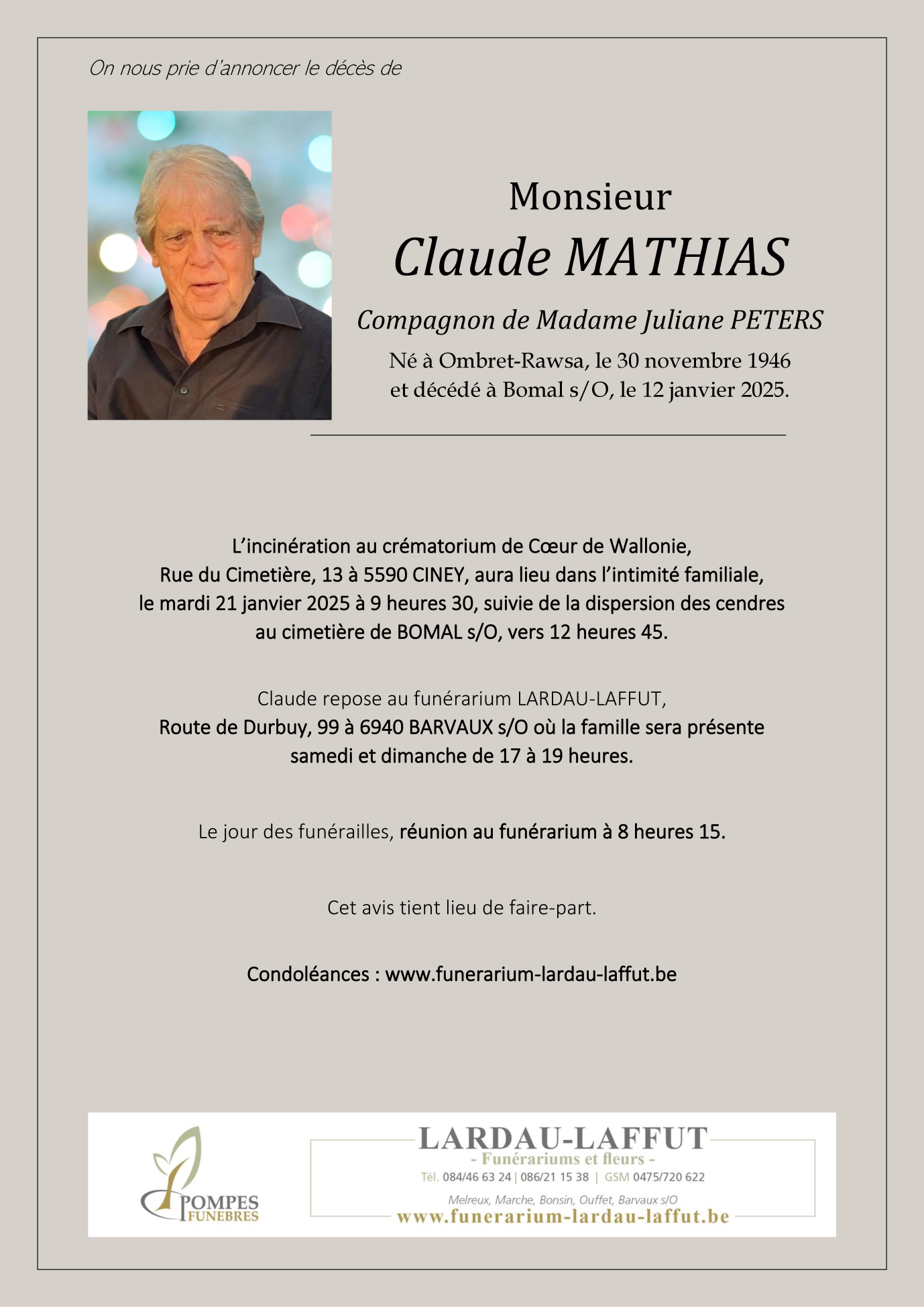 Décédé à Bomal-sur-Ourthe (6941, Belgique) le dimanche 12 janvier 2025 à l'âge de 78 ans