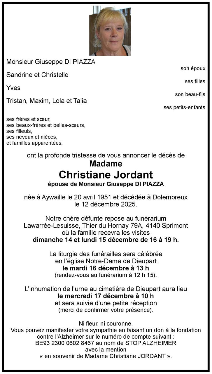Décédée à Sprimont (4140, Belgique) le vendredi 12 décembre 2025 à l'âge de 74 ans