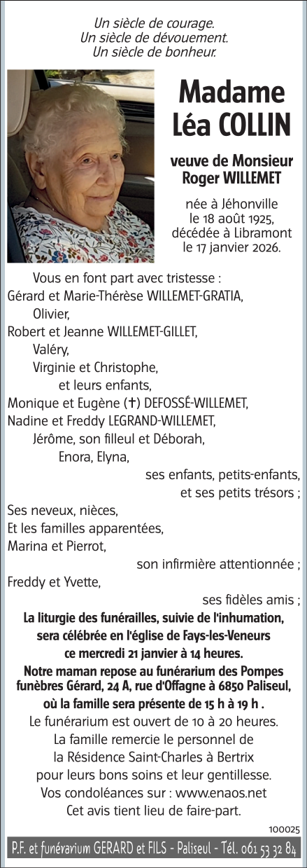 Died in Libramont (6800, Belgium) on 17 January 2026 at the age of 100 years