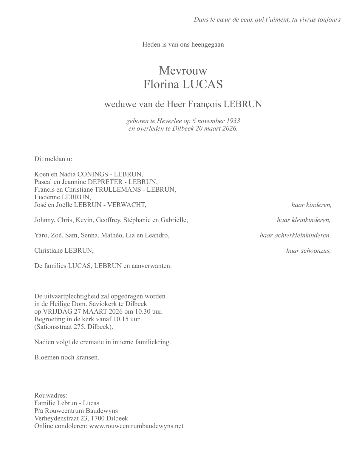 Overleden te Dilbeek (1700, België) op vrijdag 20 maart 2026 op 92-jarige leeftijd