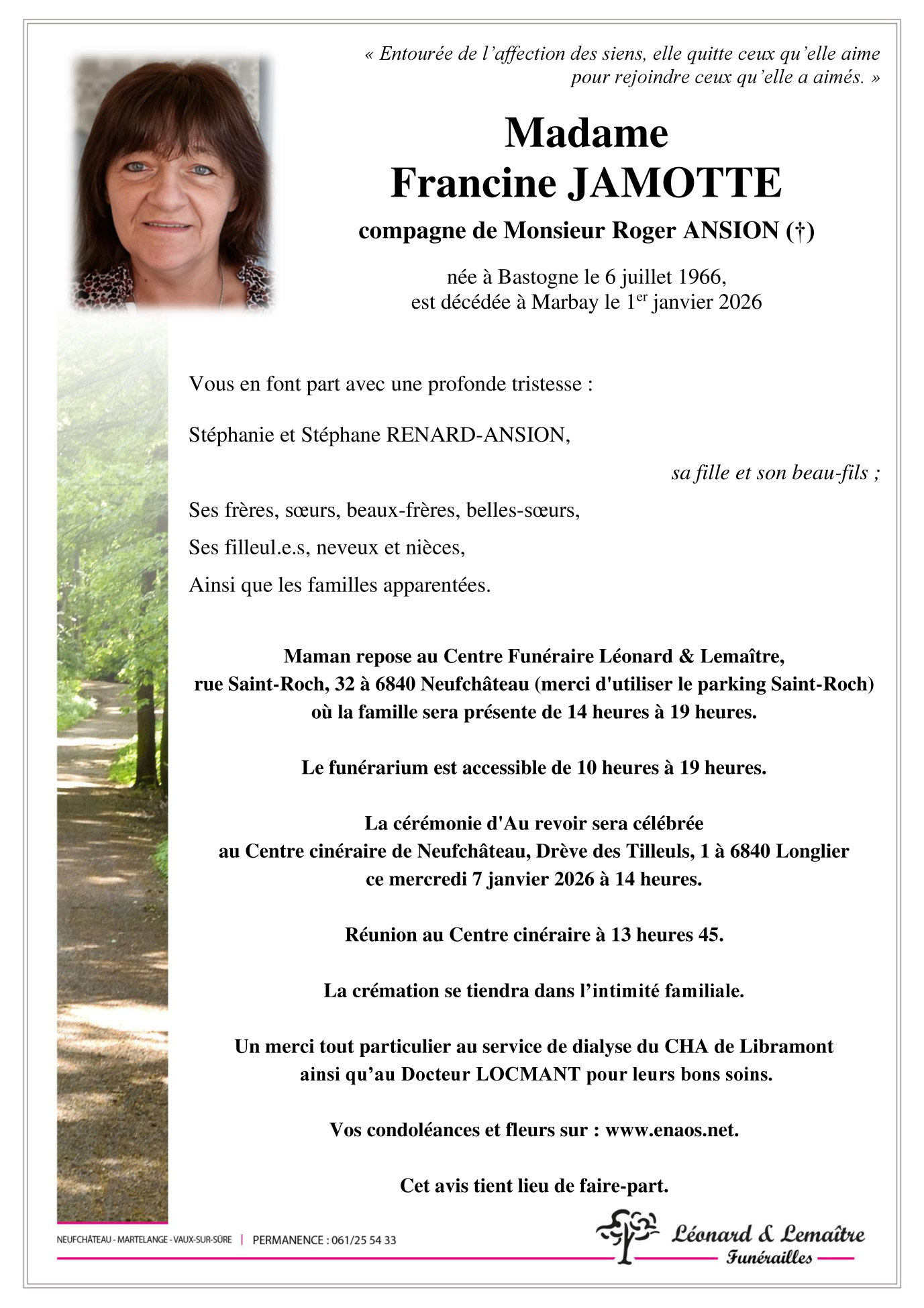 Décédée à Marbay (6840, Belgique) le jeudi 1 janvier 2026 à l'âge de 59 ans
