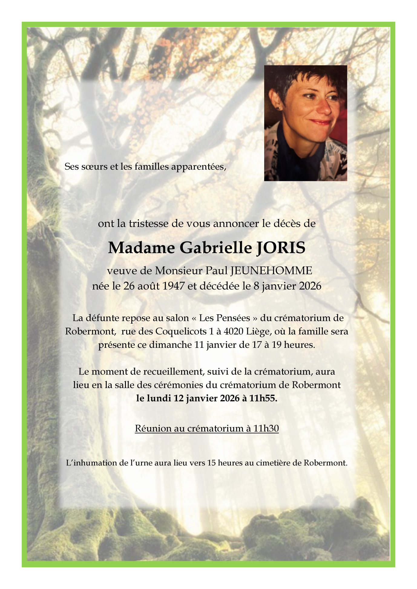 Décédée à Liège (4000, Belgique) le jeudi 8 janvier 2026 à l'âge de 78 ans