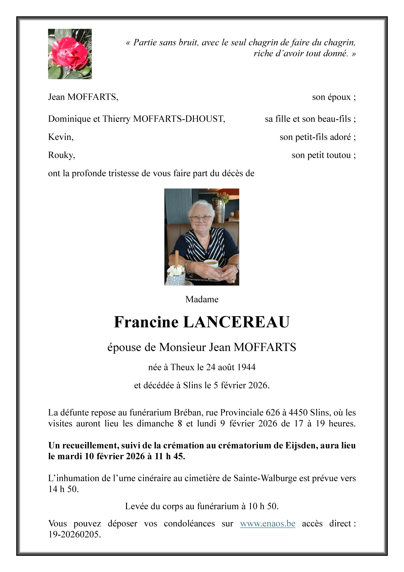 Died in Slins (4450, Belgium) on 05 February 2026 at the age of 81 years