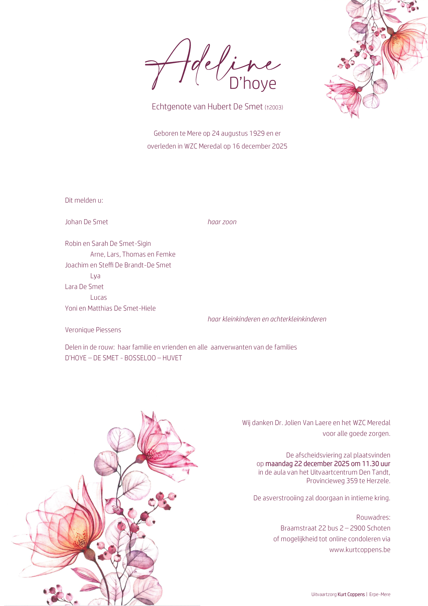 Décédée à Mere (9420, Belgique) le mardi 16 décembre 2025 à l'âge de 96 ans