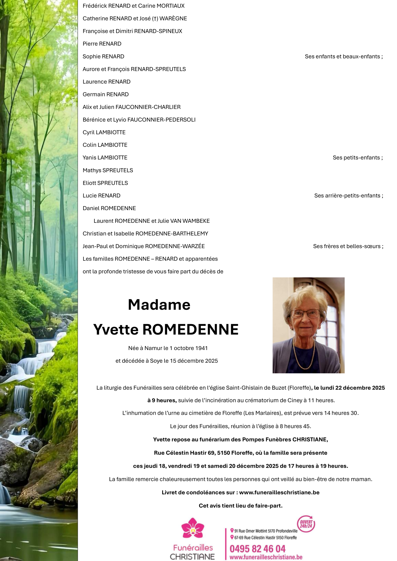 Décédée à Floreffe (5150, Belgique) le lundi 15 décembre 2025 à l'âge de 84 ans