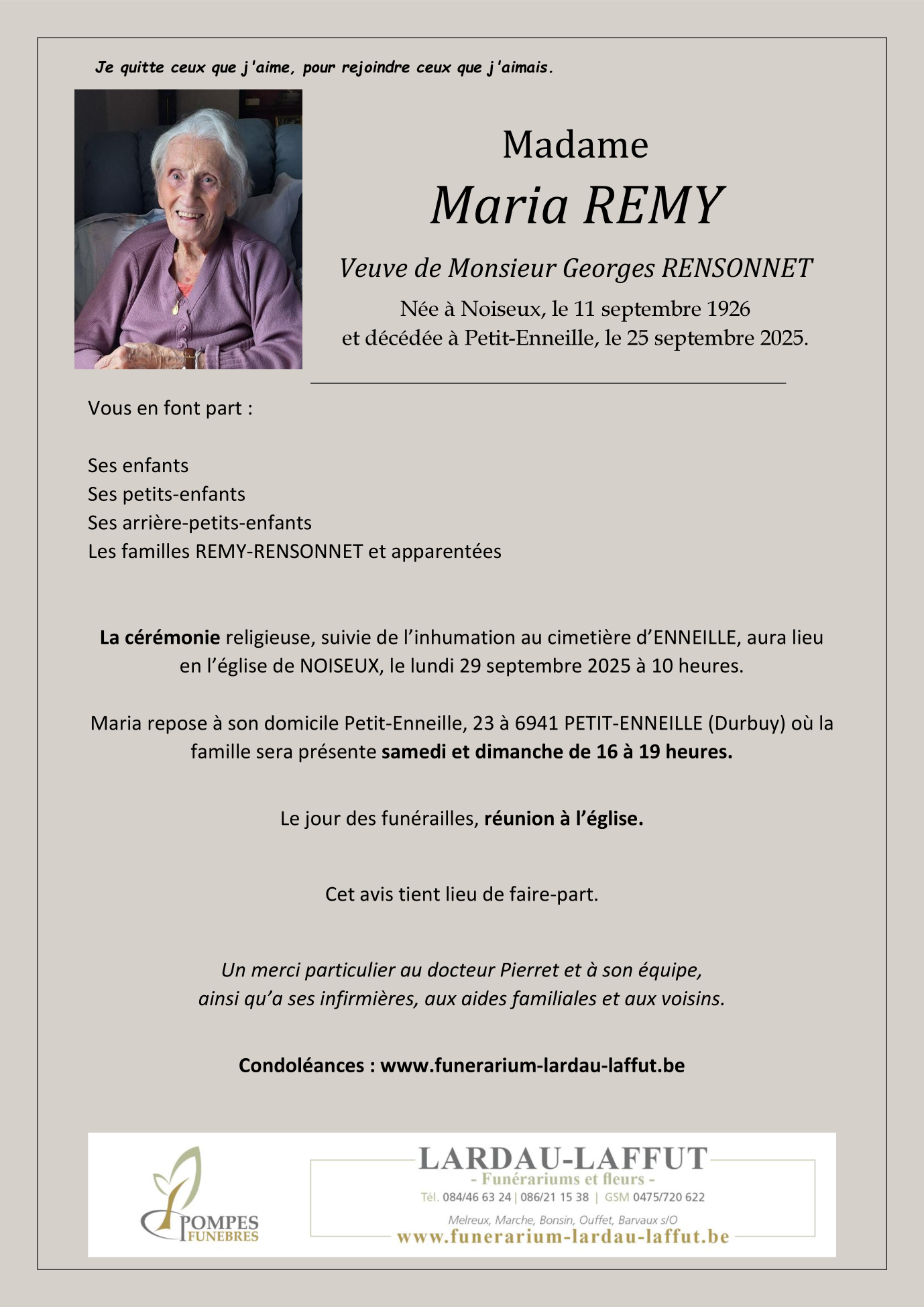 Décédée à Durbuy (6940, Belgique) le jeudi 25 septembre 2025 à l'âge de 99 ans