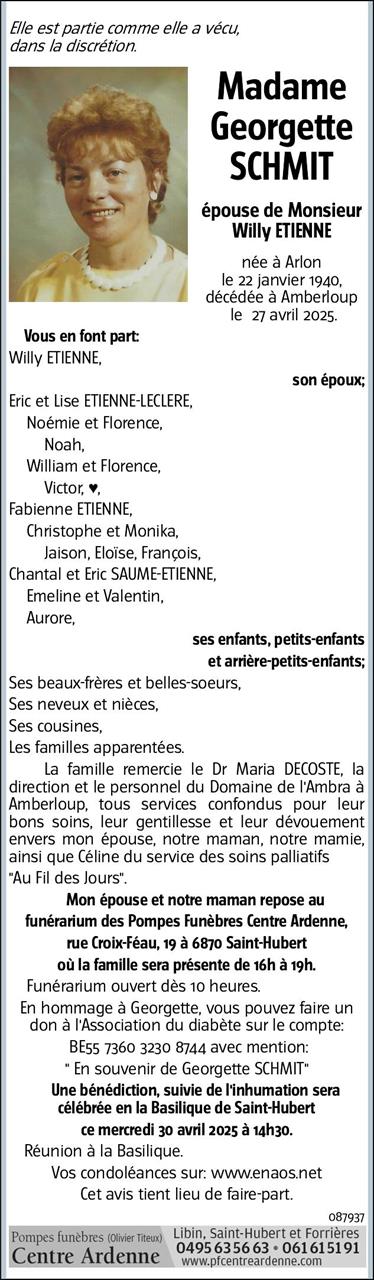 Madame Georgette SCHMIT épouse de Monsieur Willy ETIENNE