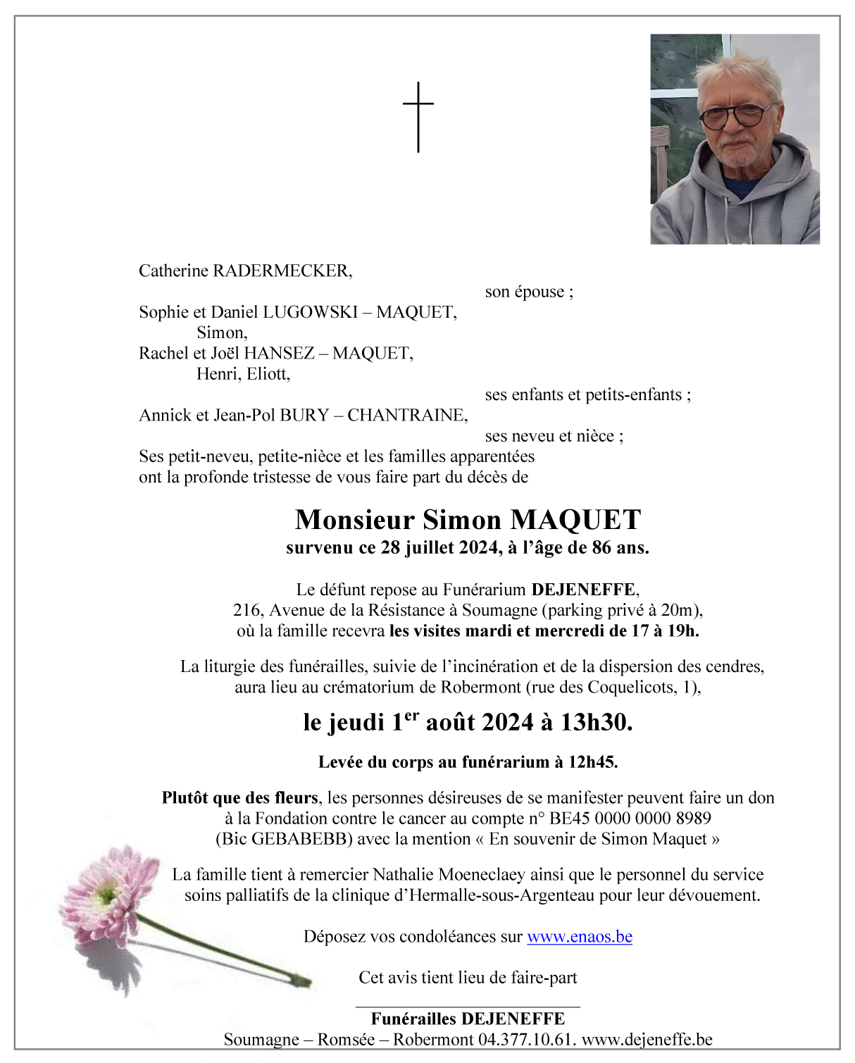Décédé à Hermalle-sous-Argenteau (4681, Belgique) le dimanche 28 juillet 2024 à l'âge de 86 ans