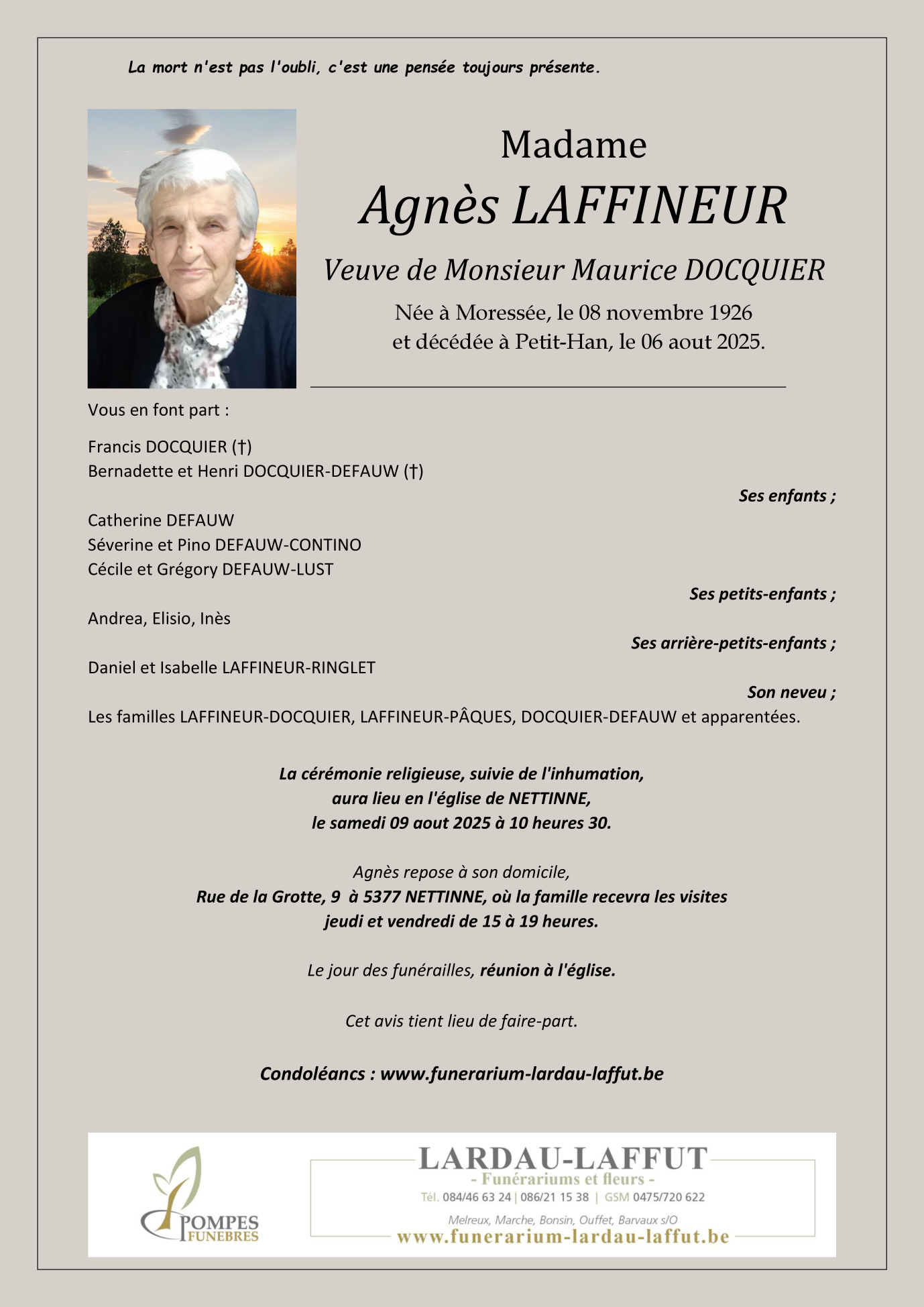 Décédée à Grandhan (6940, Belgique) le mercredi 6 août 2025 à l'âge de 98 ans
