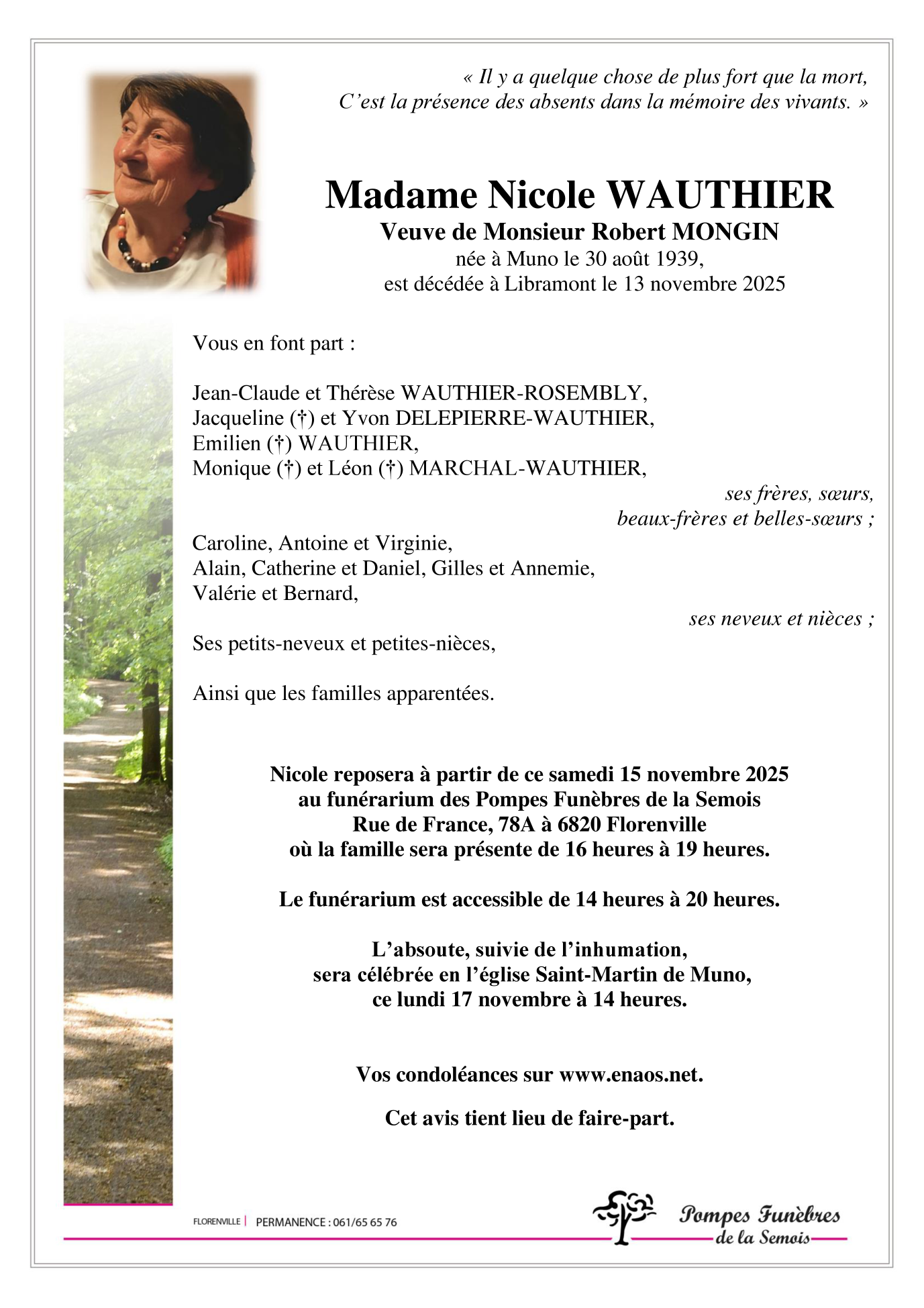 Née à Muno (6820, Belgique) le mercredi 30 août 1939