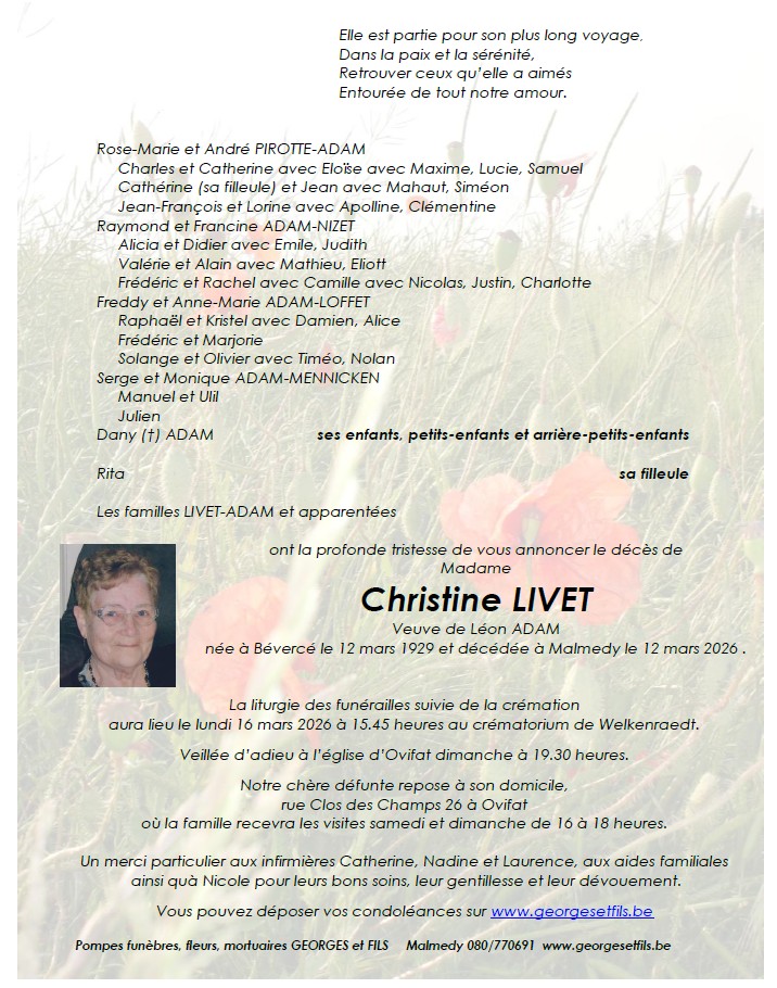 Décédée à Malmedy (4960, Belgique) le jeudi 12 mars 2026 à l'âge de 97 ans
