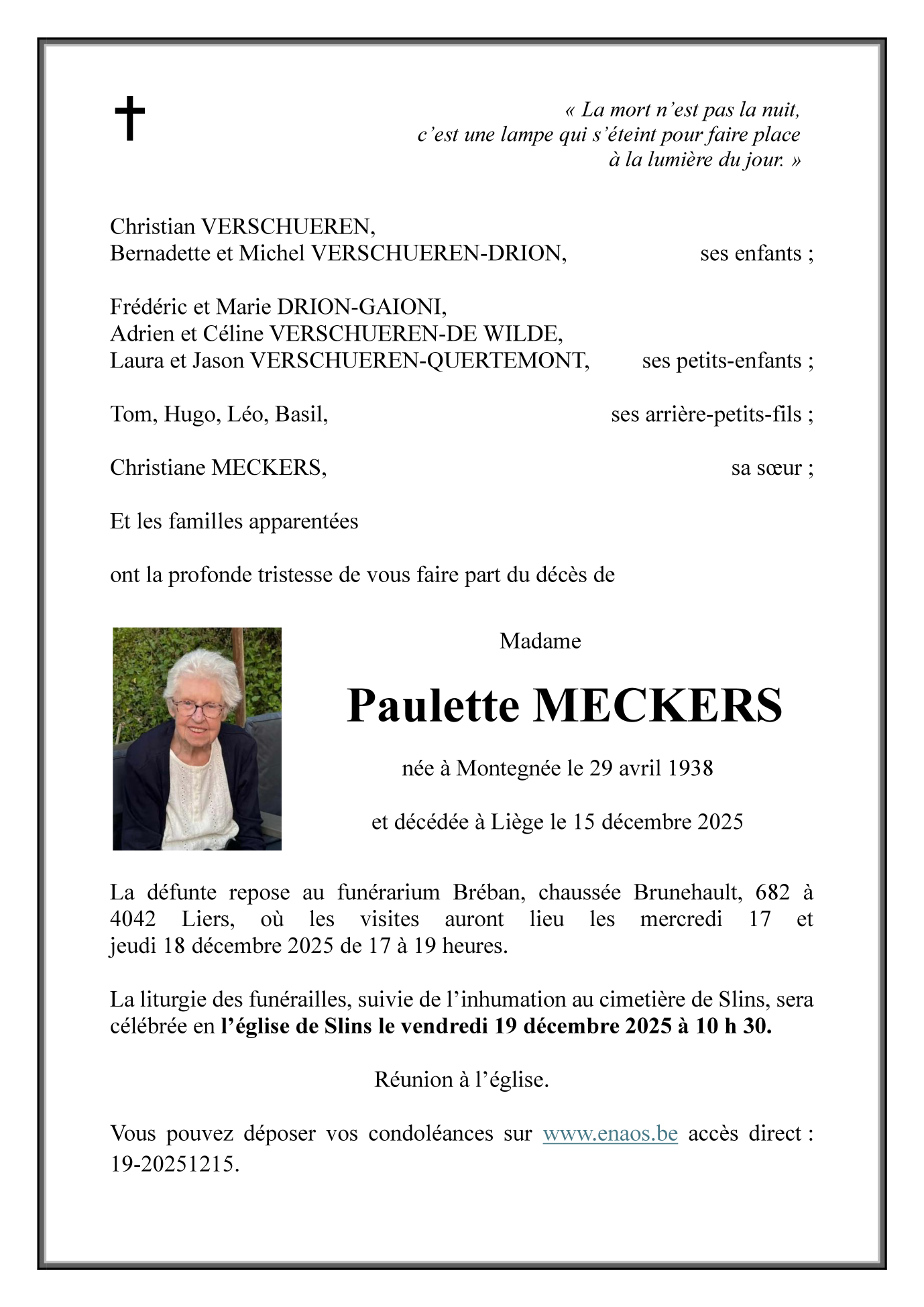 Décédée à Liège (4000, Belgique) le lundi 15 décembre 2025 à l'âge de 87 ans
