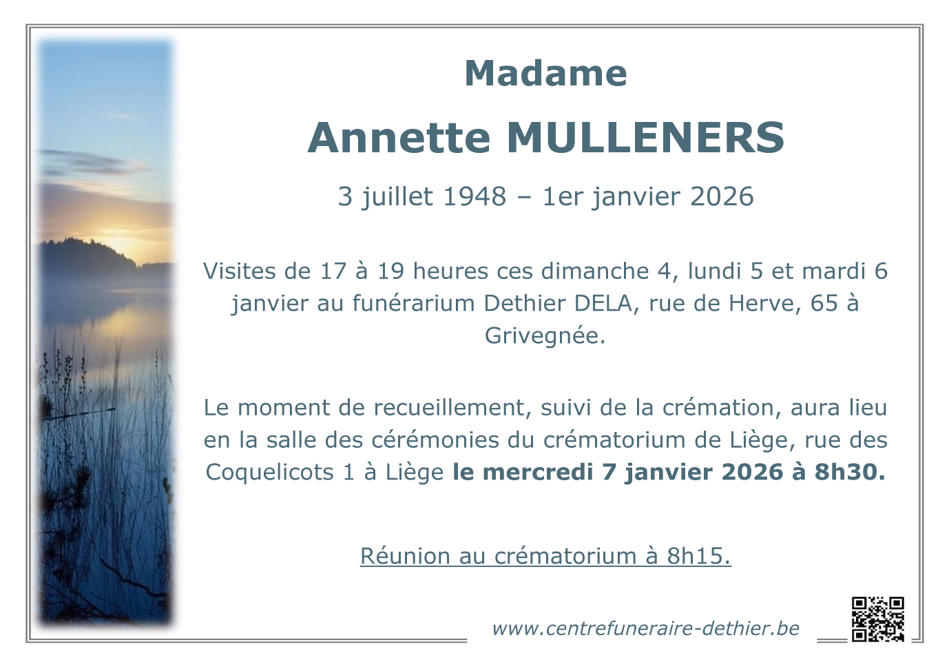 Décédée à Liège (4000, Belgique) le jeudi 1 janvier 2026 à l'âge de 77 ans