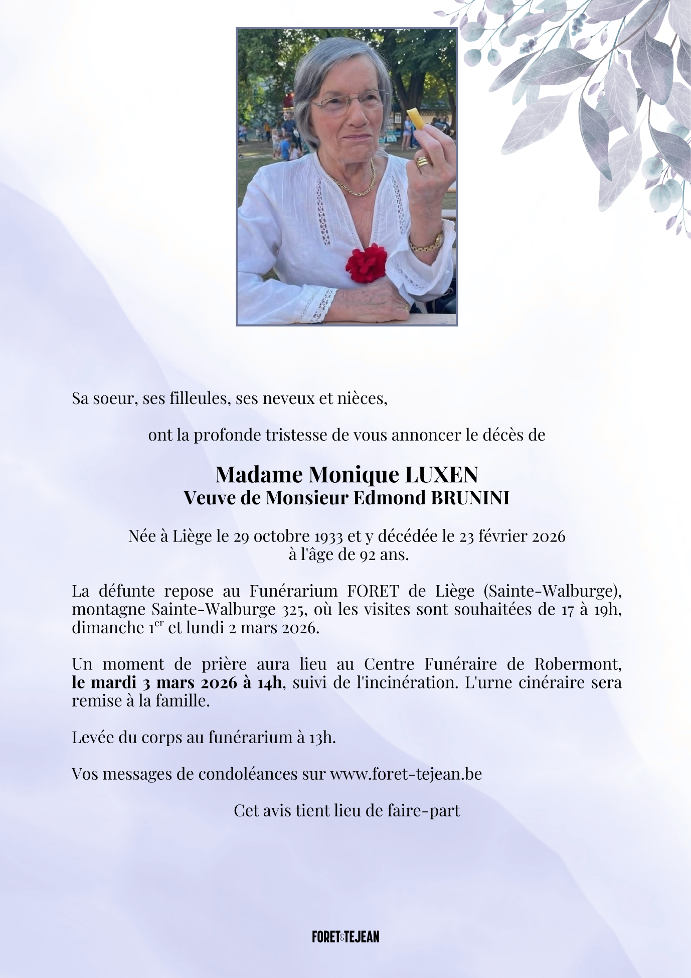 Died in Liège (4000, Belgium) on 23 February 2026 at the age of 92 years