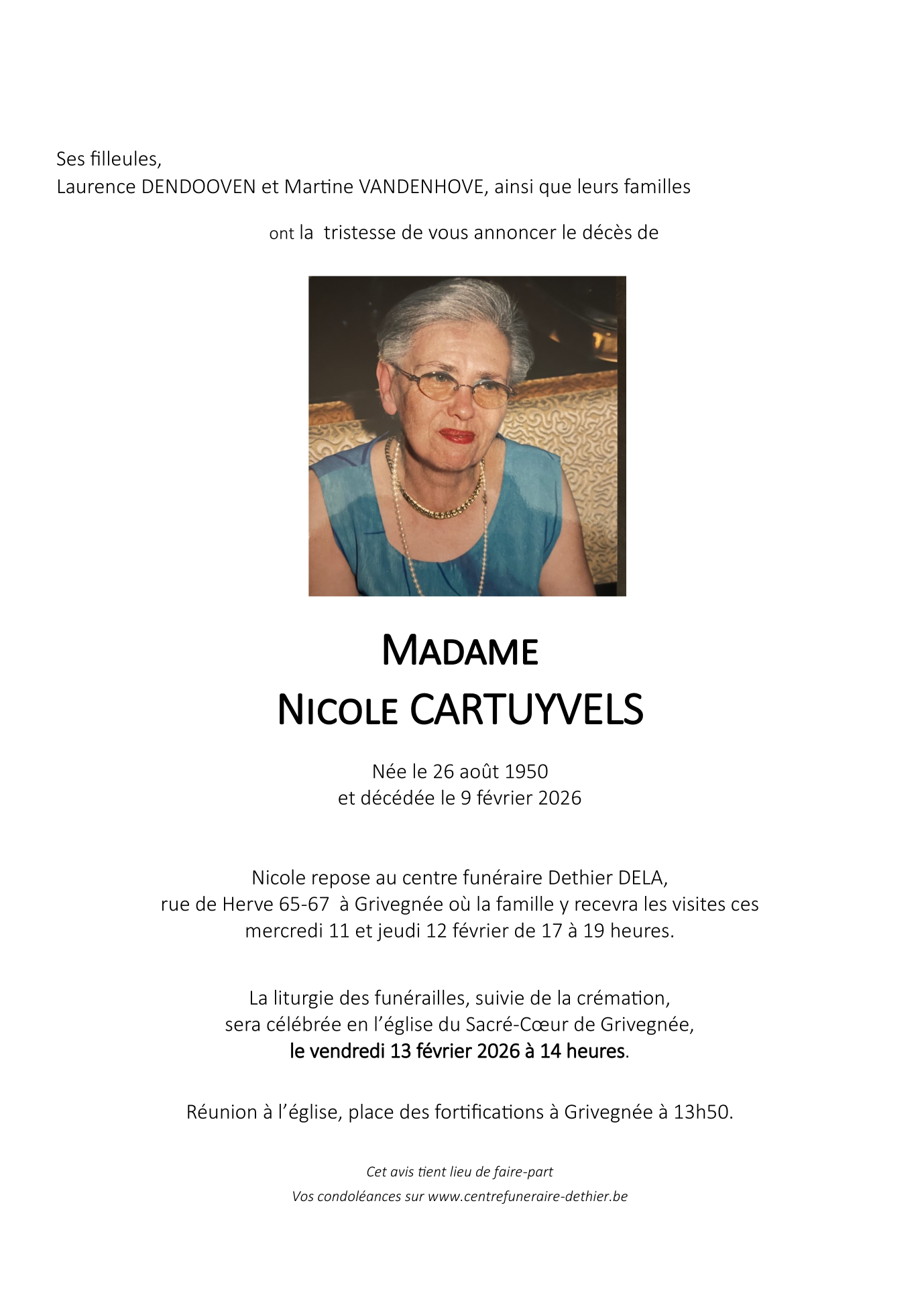 Décédée à Liège (4000, Belgique) le lundi 9 février 2026 à l'âge de 75 ans