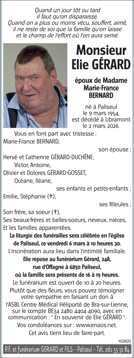 Décédé à Libramont (6800, Belgique) le lundi 2 mars 2026 à l'âge de 71 ans