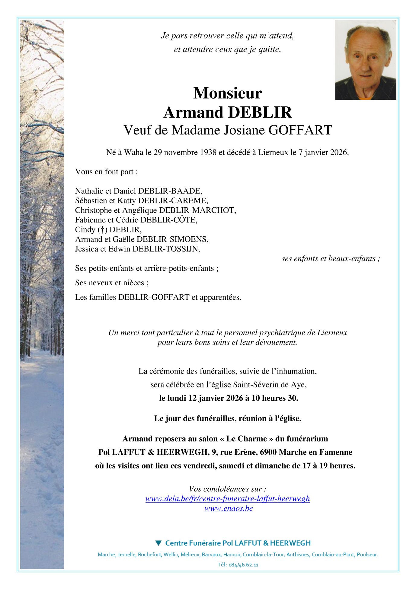 Décédé à Lierneux (4990, Belgique) le mercredi 7 janvier 2026 à l'âge de 87 ans