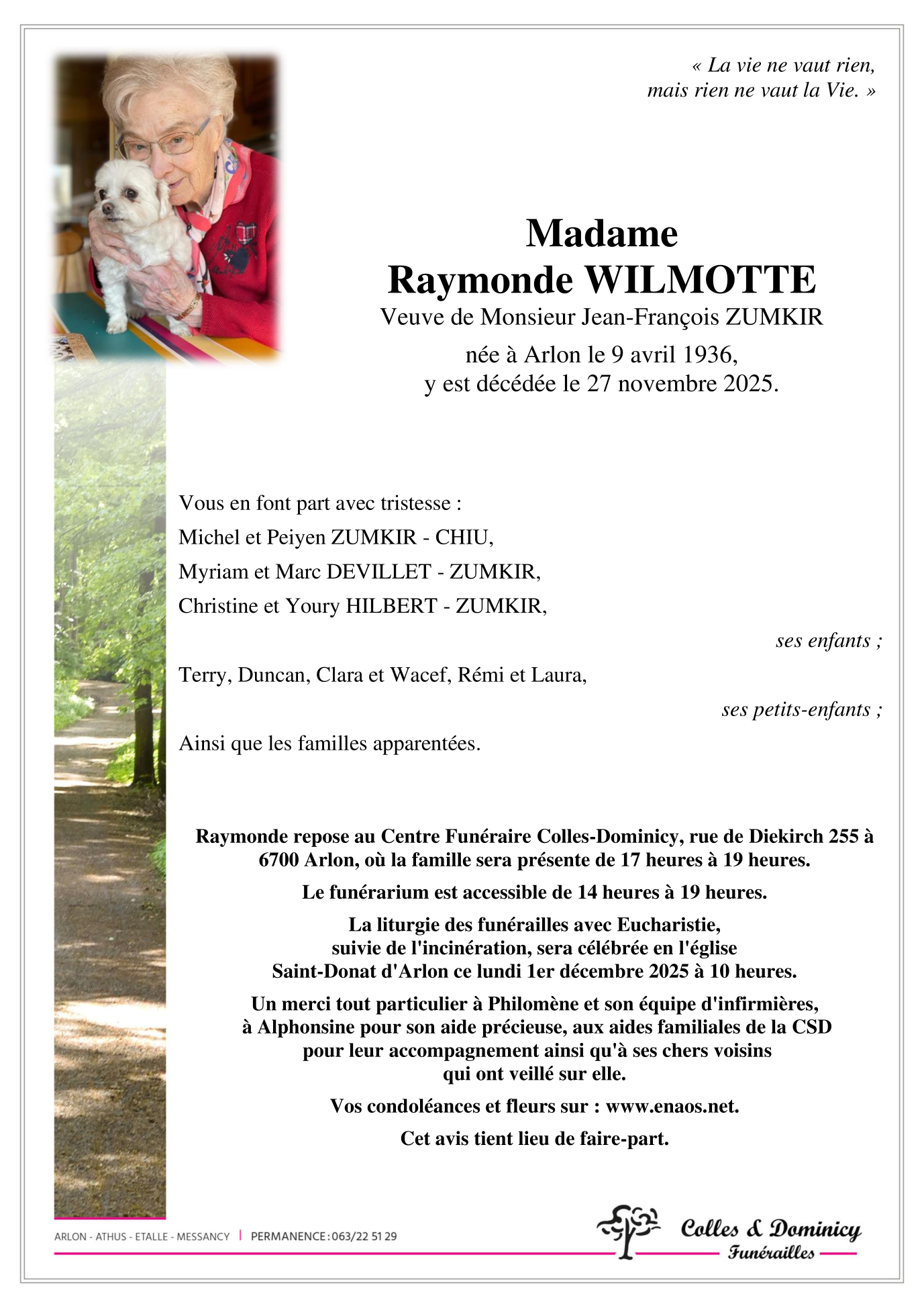 Décédée à Arlon (6700, Belgique) le jeudi 27 novembre 2025 à l'âge de 89 ans