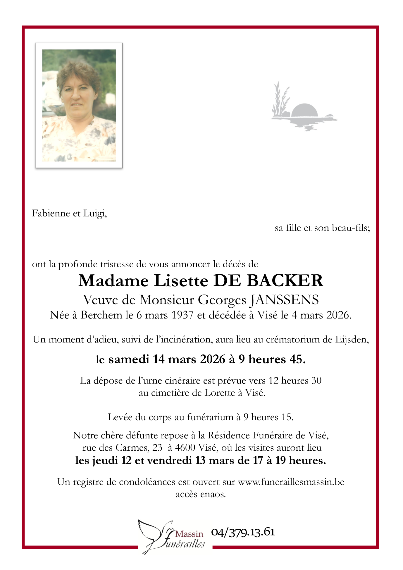 Décédée à Visé (4600, Belgique) le mercredi 4 mars 2026 à l'âge de 88 ans
