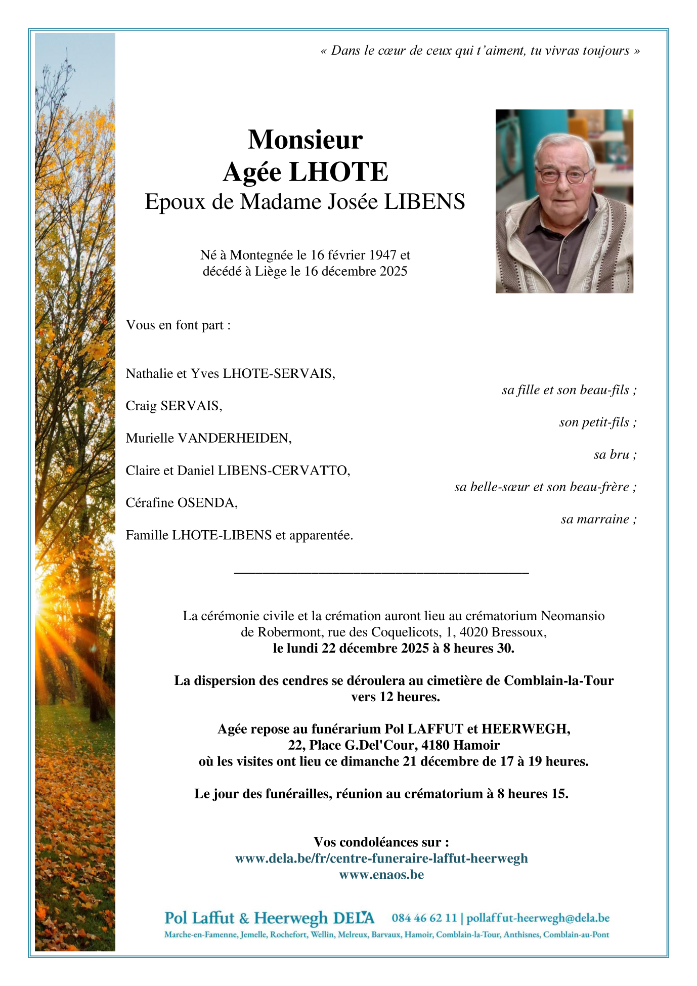 Died in Liège (4000, Belgium) on 16 December 2025 at the age of 78 years