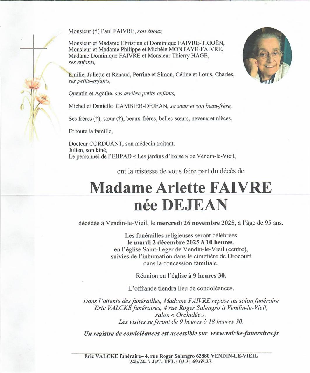 Madame Arlette FAIVRE née DEJEAN