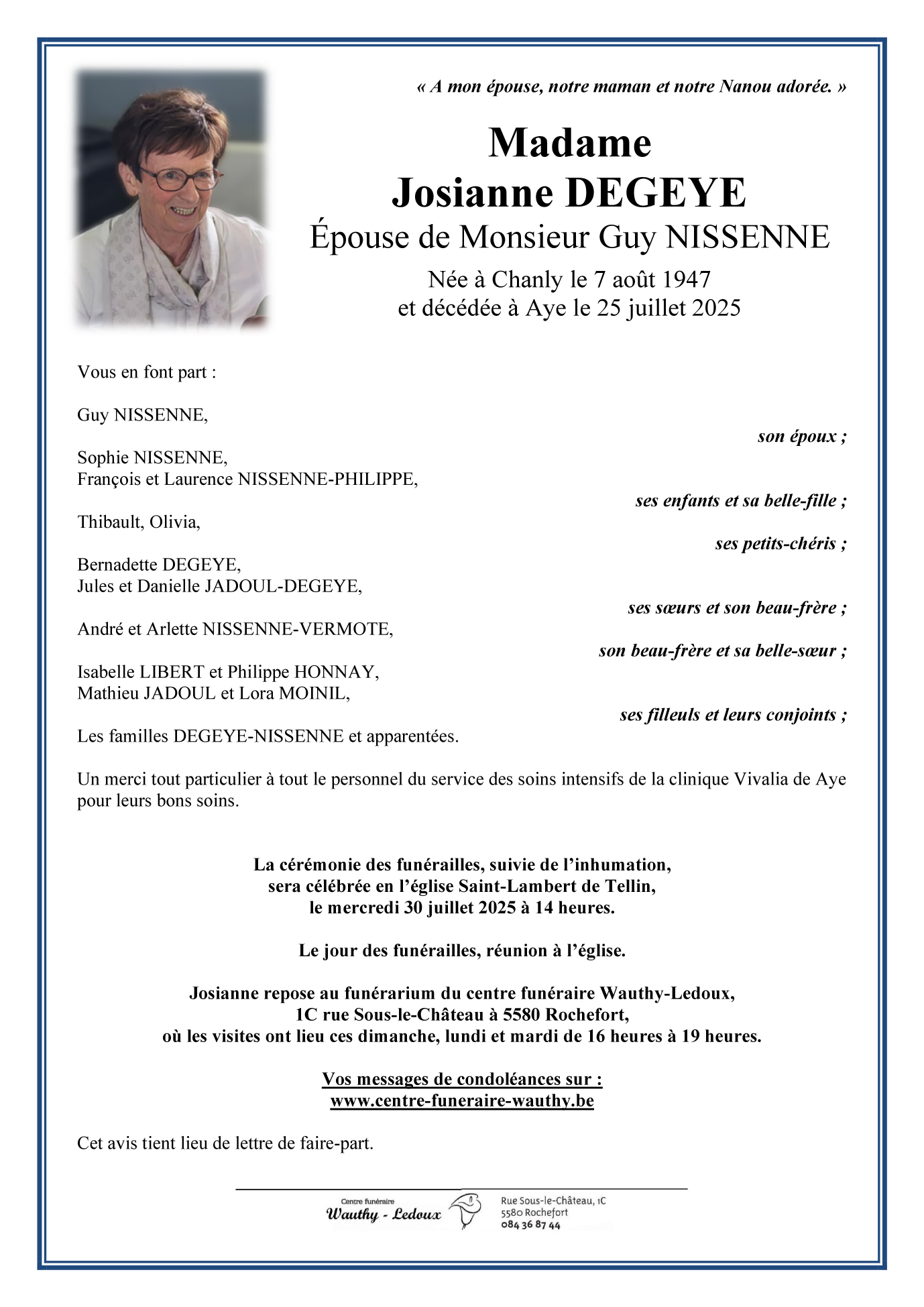Décédée à Aye (6900, Belgique) le vendredi 25 juillet 2025 à l'âge de 77 ans