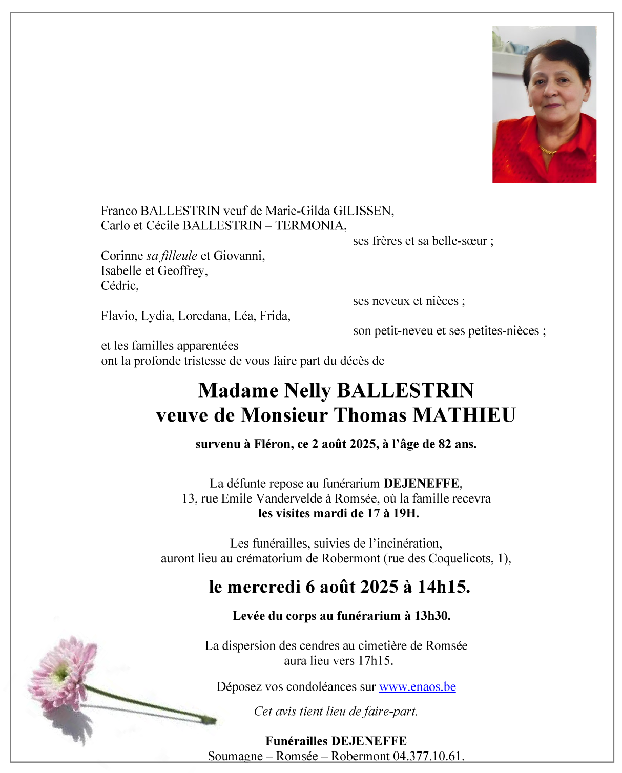Décédée à Fléron (4620, Belgique) le samedi 2 août 2025 à l'âge de 82 ans