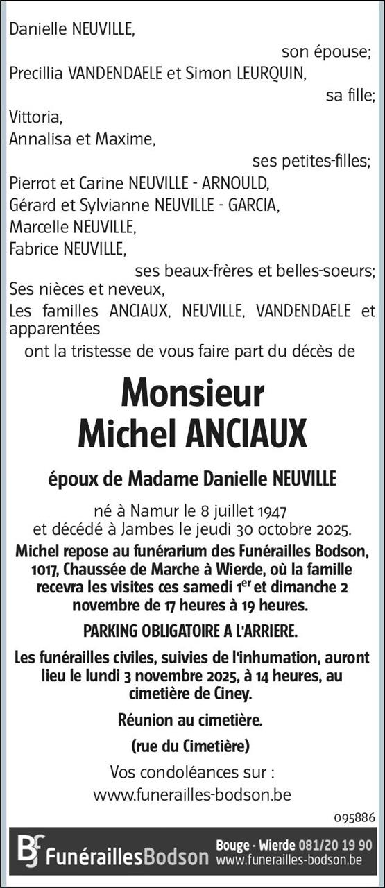 Décédé à Jambes (5100, Belgique) le jeudi 30 octobre 2025 à l'âge de 78 ans