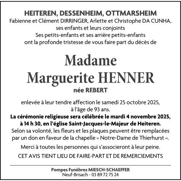 Décédée à Colmar (68000, France) le samedi 25 octobre 2025 à l'âge de 93 ans