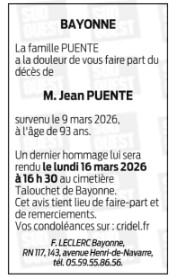 Décédé à Bayonne (64100, France) le lundi 9 mars 2026 à l'âge de 93 ans
