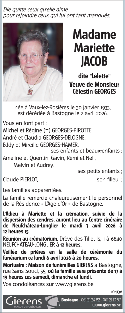 Fallecida en Bastogne (6600, Bélgica) el jueves, 2 de abril de 2026 a la edad de 93 años