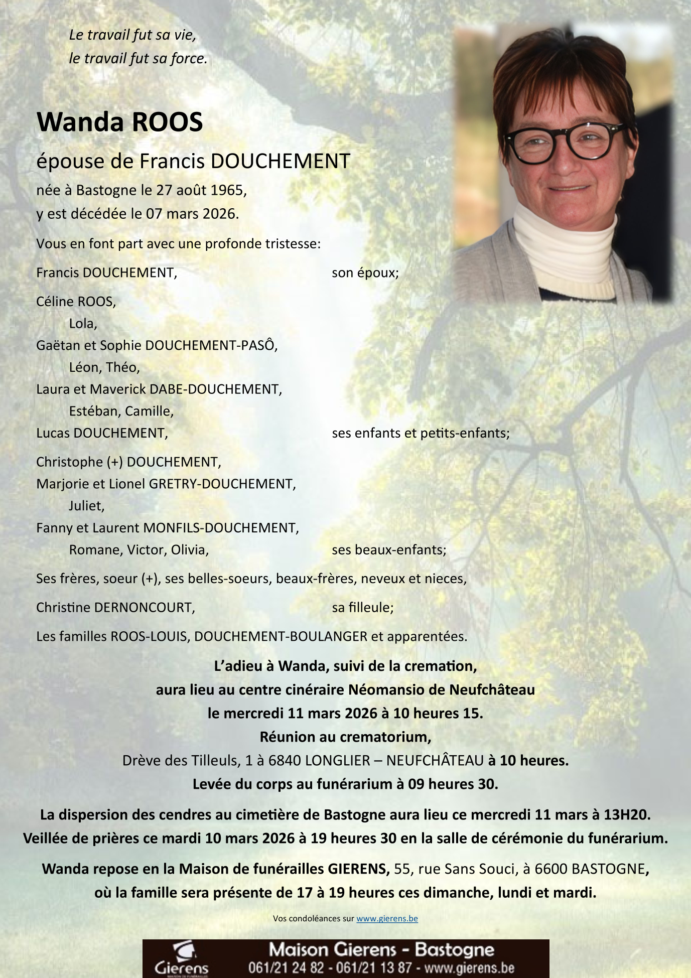 Fallecida en Bastogne (6600, Bélgica) el sábado, 7 de marzo de 2026 a la edad de 60 años