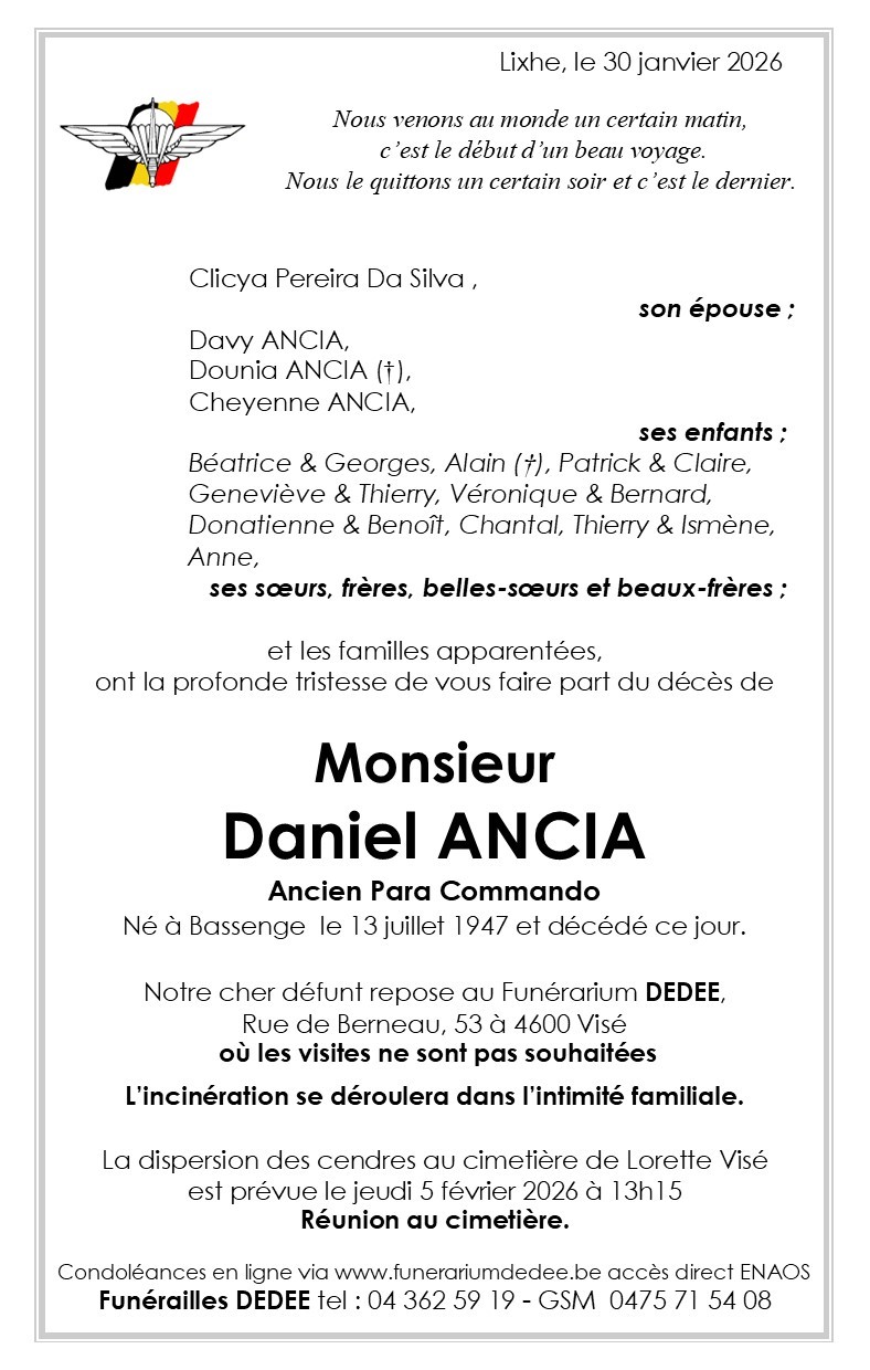 Died in Hermalle-sous-Argenteau (4681, Belgium) on 30 January 2026 at the age of 78 years