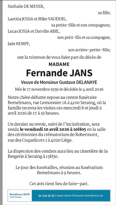 Décédée à Seraing (4100, Belgique) le samedi 4 avril 2026 à l'âge de 86 ans