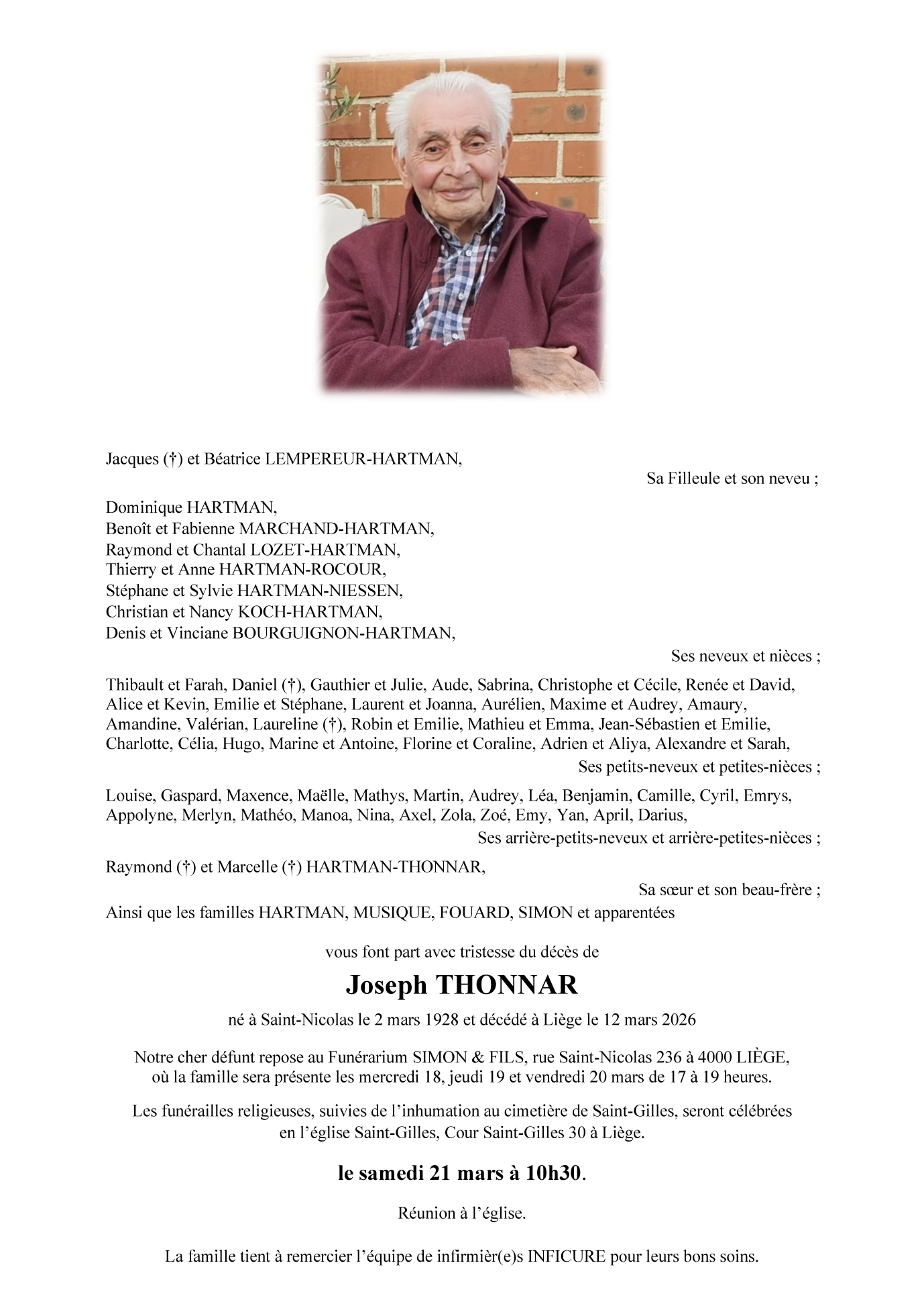 Décédé à Liège (4000, Belgique) le jeudi 12 mars 2026 à l'âge de 98 ans