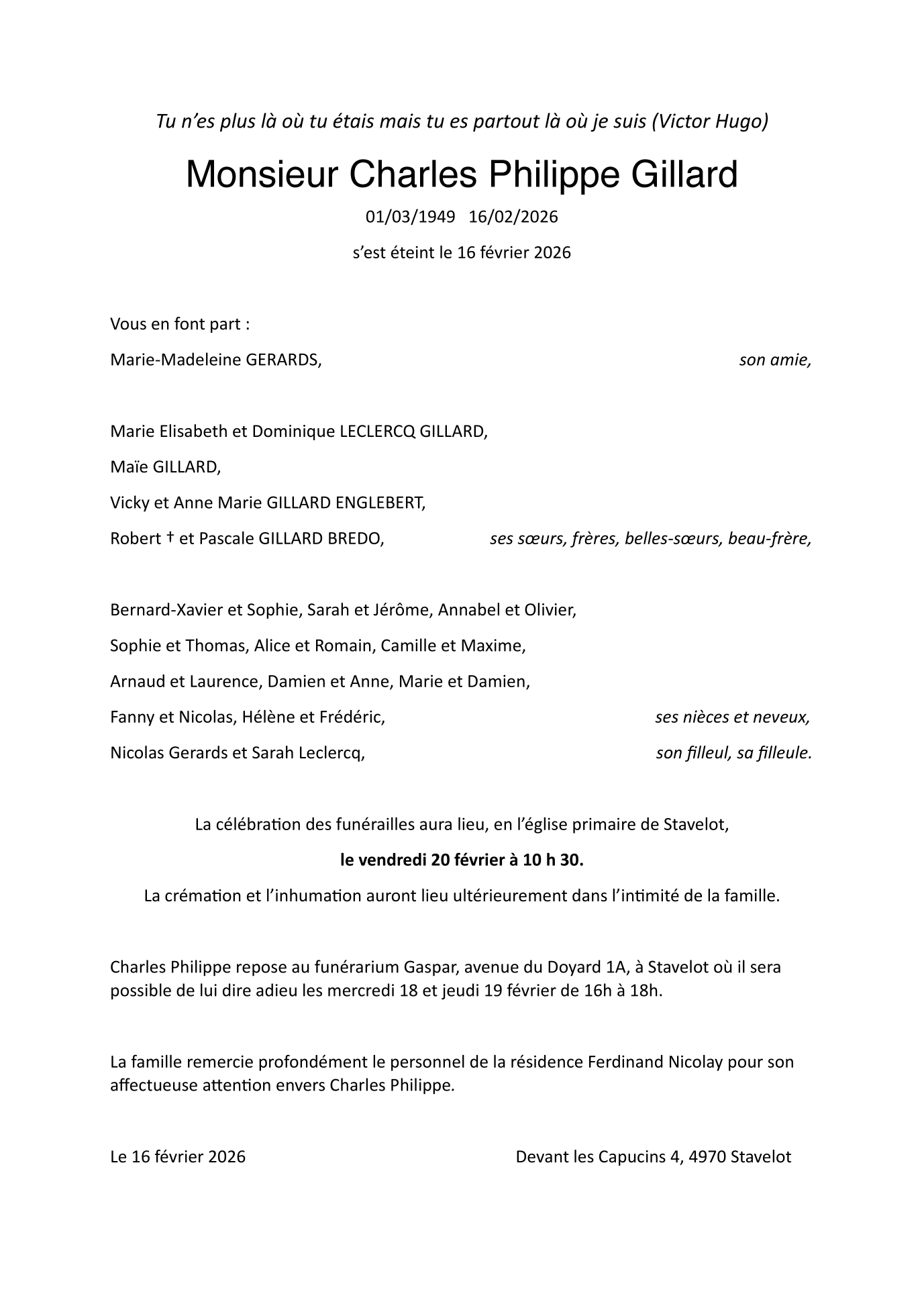 Overleden te Stavelot (4970, België) op maandag 16 februari 2026 op 76-jarige leeftijd