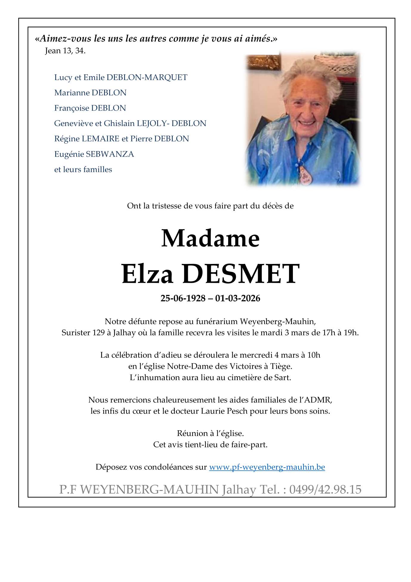 Décédée à Tiège (4845, Belgique) le dimanche 1 mars 2026 à l'âge de 97 ans