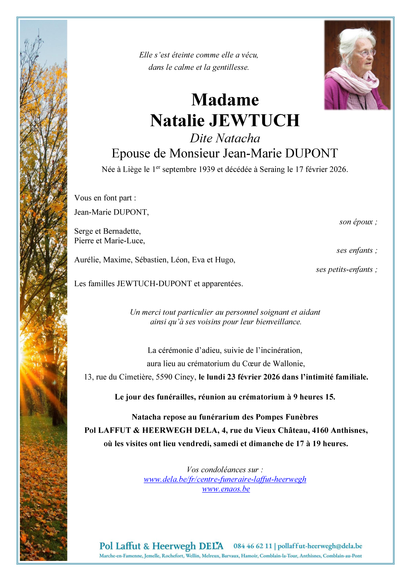 Décédée à Seraing (4100, Belgique) le mardi 17 février 2026 à l'âge de 86 ans