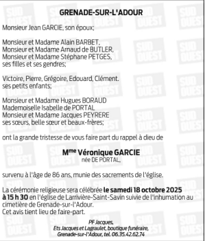 Décédée à Mont-de-Marsan (40000, France) le mardi 14 octobre 2025 à l'âge de 86 ans