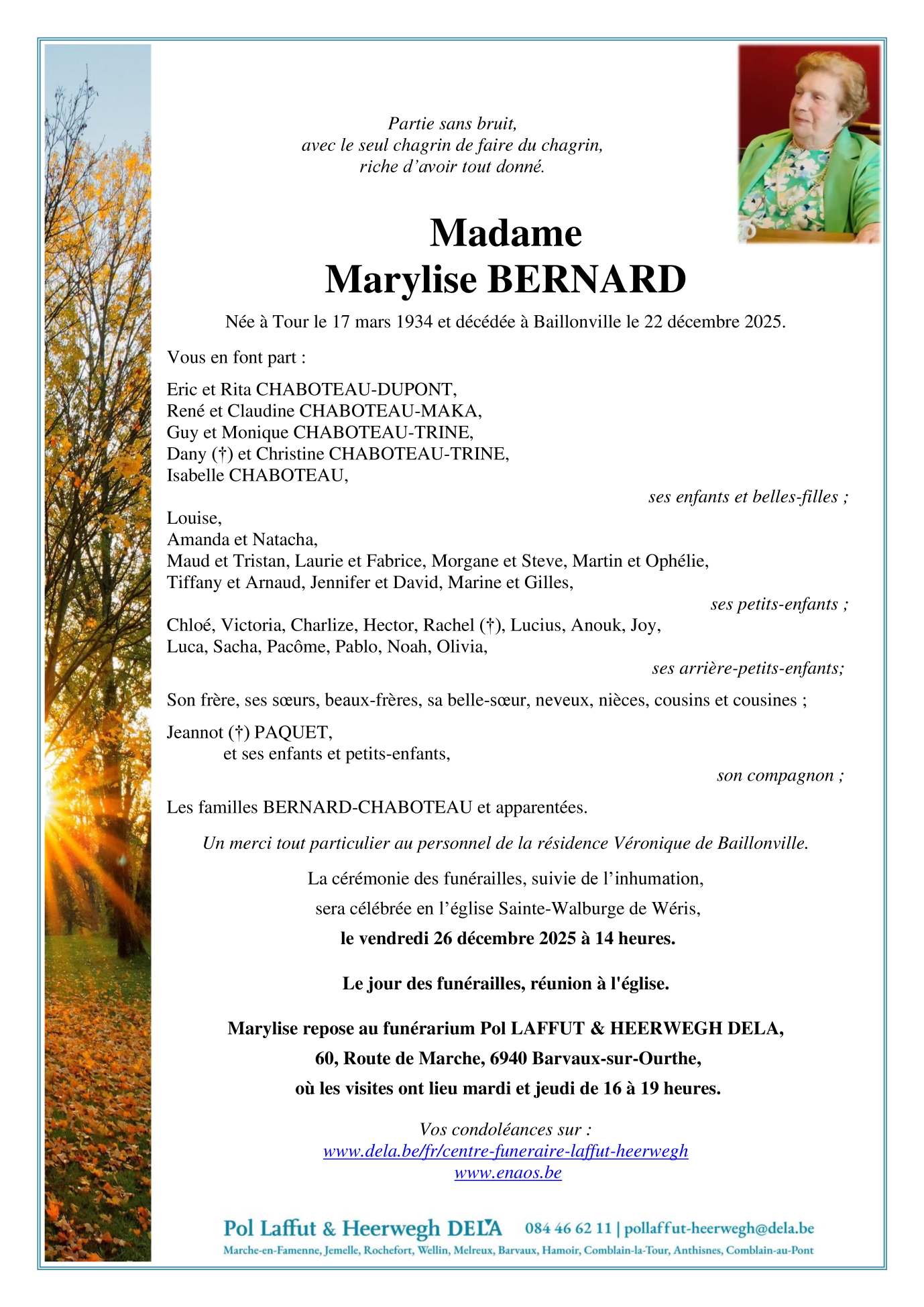 Décédée à Baillonville (5377, Belgique) le lundi 22 décembre 2025 à l'âge de 91 ans