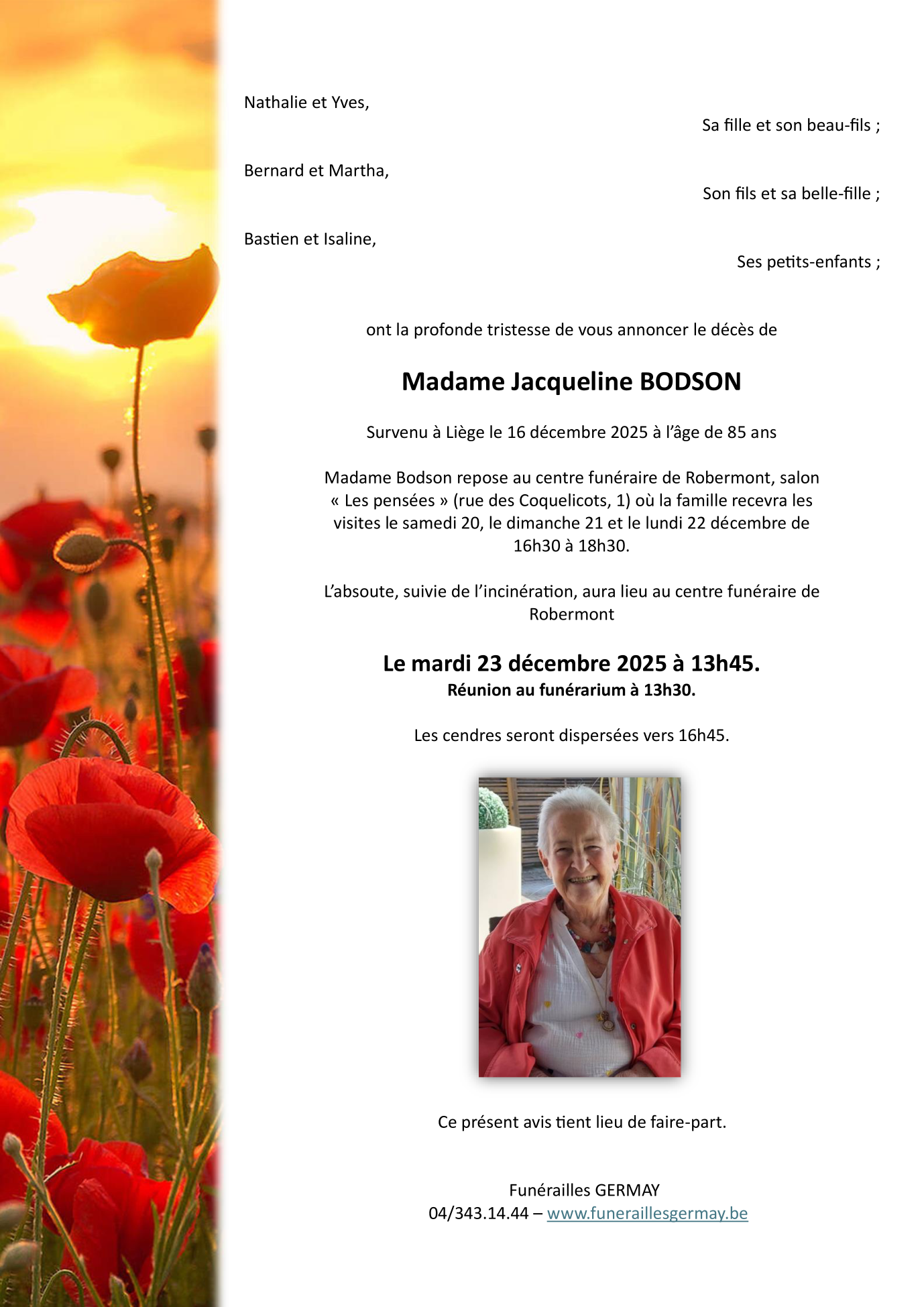 Décédée à Chênée (4032, Belgique) le mardi 16 décembre 2025 à l'âge de 85 ans