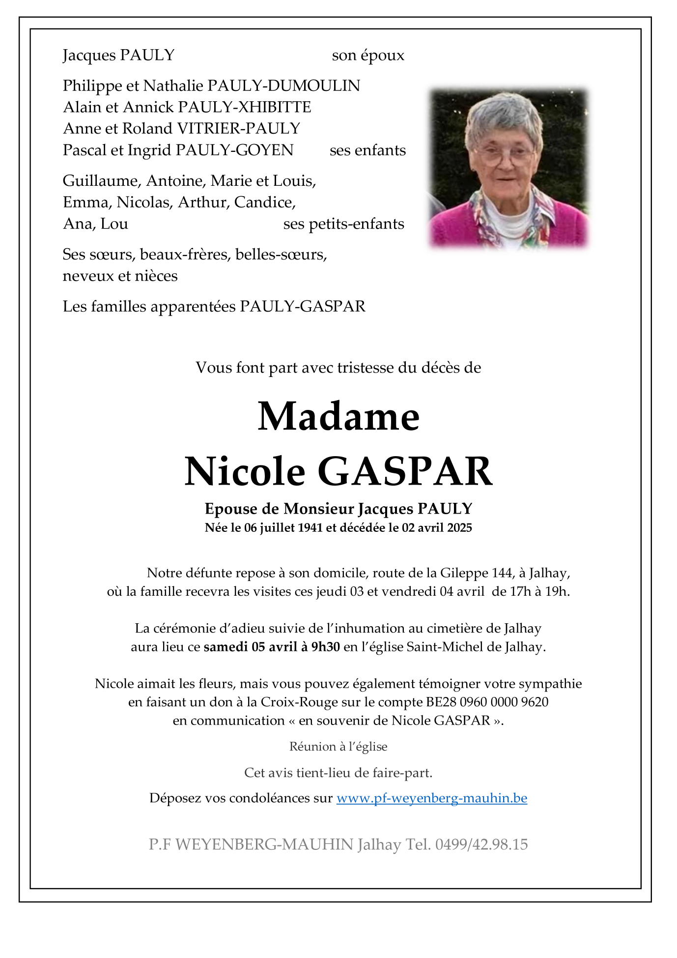 Fallecida en Jalhay (4845, Bélgica) el miércoles, 2 de abril de 2025 a la edad de 83 años