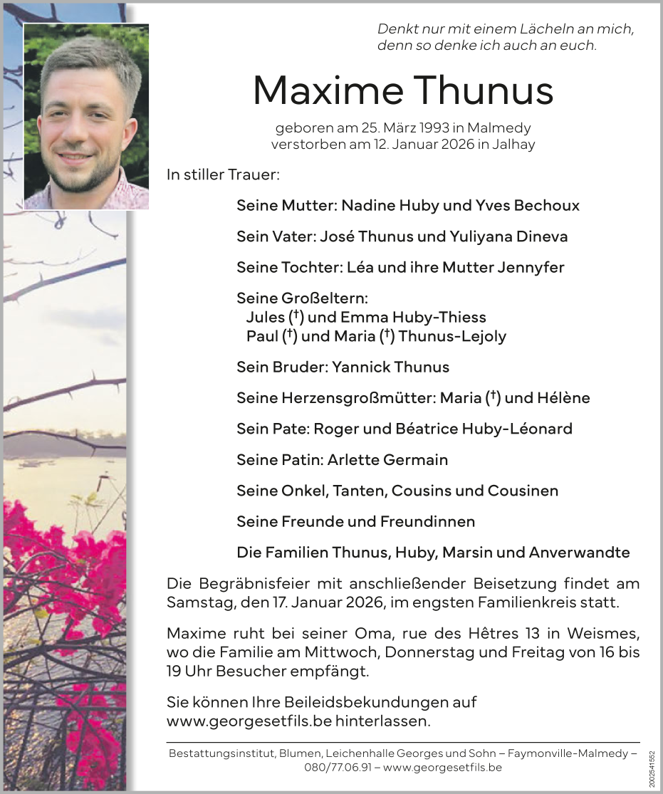 Décédé à Jalhay (4845, Belgique) le lundi 12 janvier 2026 à l'âge de 32 ans