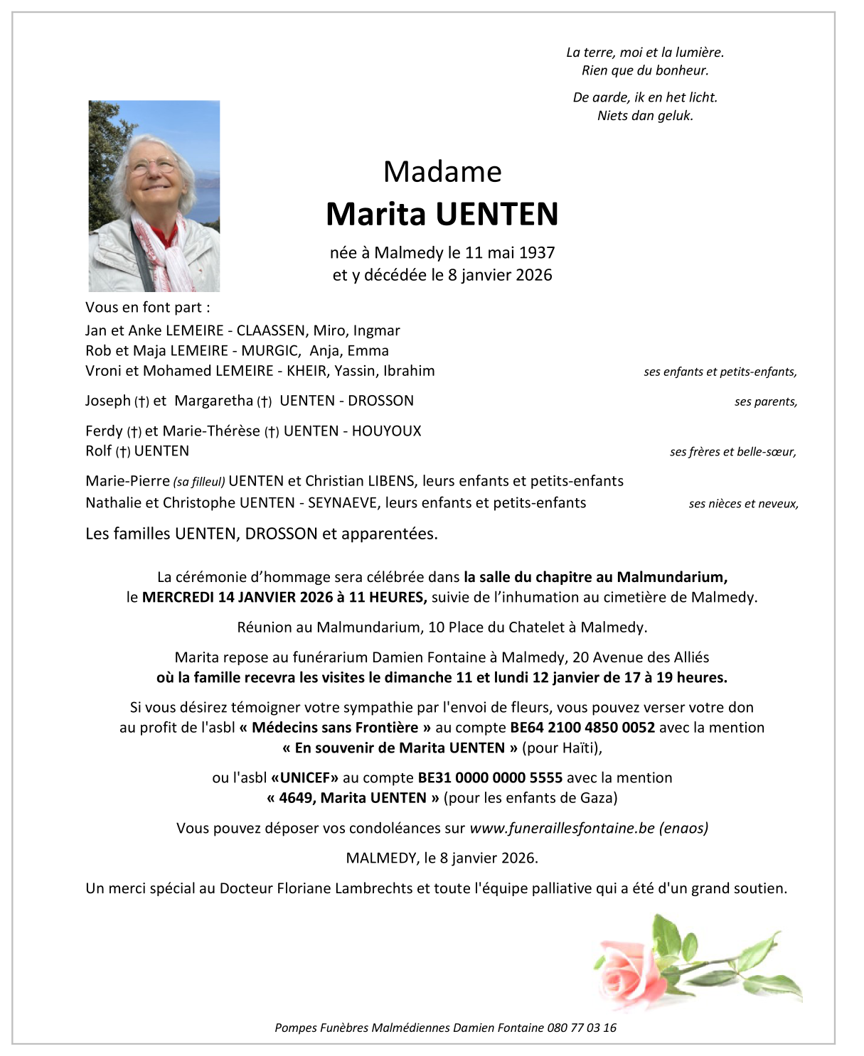 Décédée à Malmedy (4960, Belgique) le jeudi 8 janvier 2026 à l'âge de 88 ans