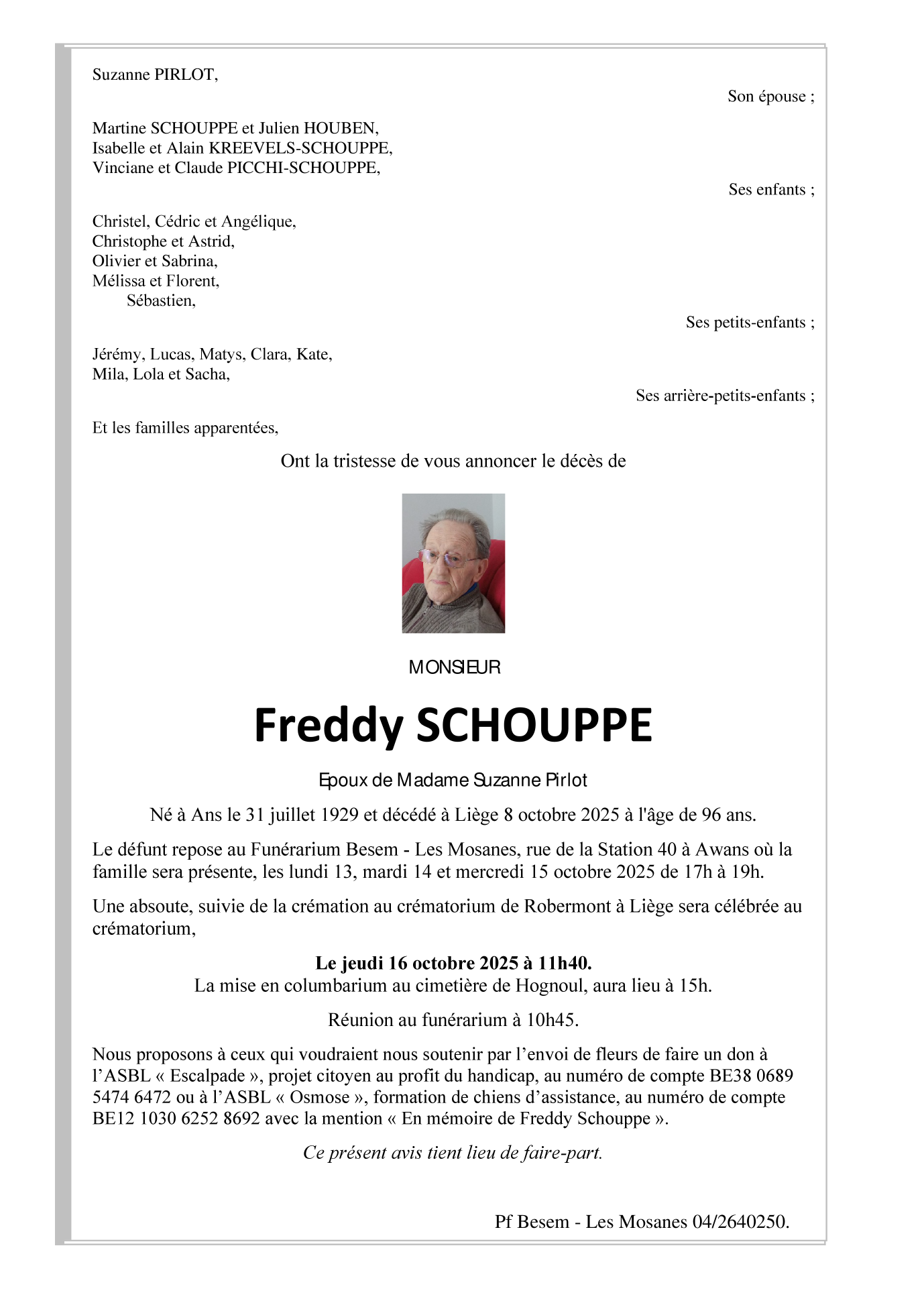 Décédé à Liège (4000, Belgique) le mercredi 8 octobre 2025 à l'âge de 96 ans