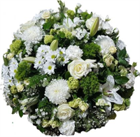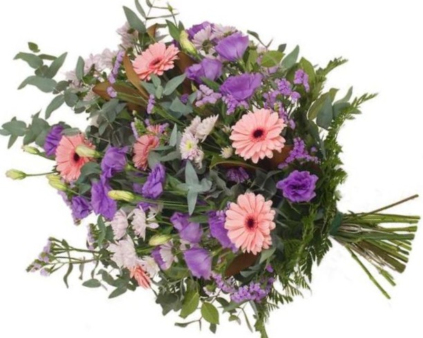 Elégante gerbe piquée mousse à base de fleurs précieuses et de saison -Taille M : 70 / 75 cm - Ruban inclus avec 50 caractères max - Tonalité au choix : Blanc/Vert ou Blanc/Parme ou Rose/Fuchsia ou Pastel ou Coloré -